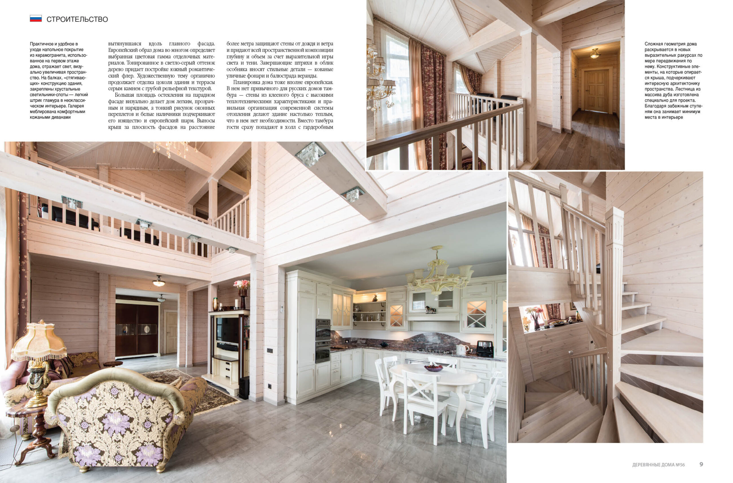 Дизайн интерьеров также отмечен влиянием европейских стилей. Его обустройством занимались сами хозяева дома. Архитектоника и конструктивная система здания помогли сформировать интересное внутреннее пространство. Так, например, балки каркаса на уровне перекрытия между первым и вторым этажами задают ритм интерьера и подчеркивают его масштаб. Размещенные на них с определенным шагом хрустальные светильники-споты стали частью многоуровневой концепции освещения, предусматривающей различные сценарии.