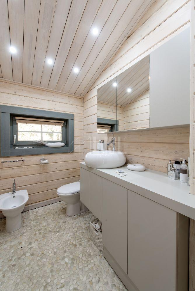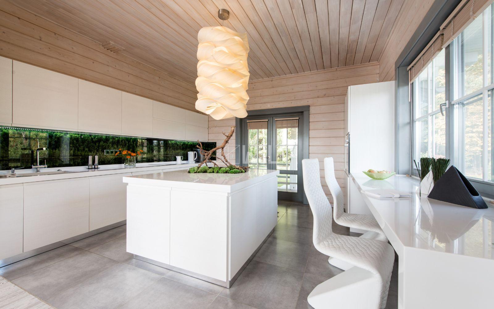 На главном фасаде выполнено панорамное остекление. Благодаря ему в дом проникает много света, а красивый ландшафт становится органичной частью интерьеров.