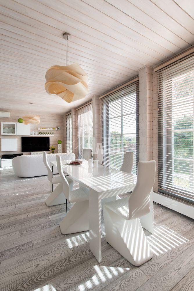 В проекте обыграны японские мотивы. Так в белой, наполненной светом, гостиной нашли свое место дизайнерские светильники-оригами и необычный столик. Столешница сделана из столетней итальянской шпалы, очищенной мастерами от вековой копоти и превращенной в уникальный арт-объект.